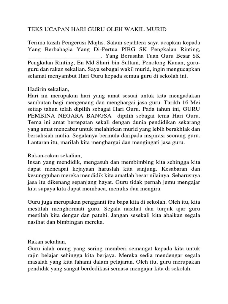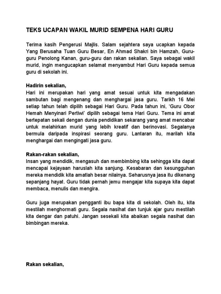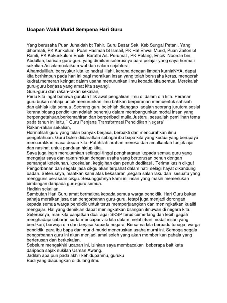 Teks Ucapan Ketua Murid Sempena Hari Guru Pdf