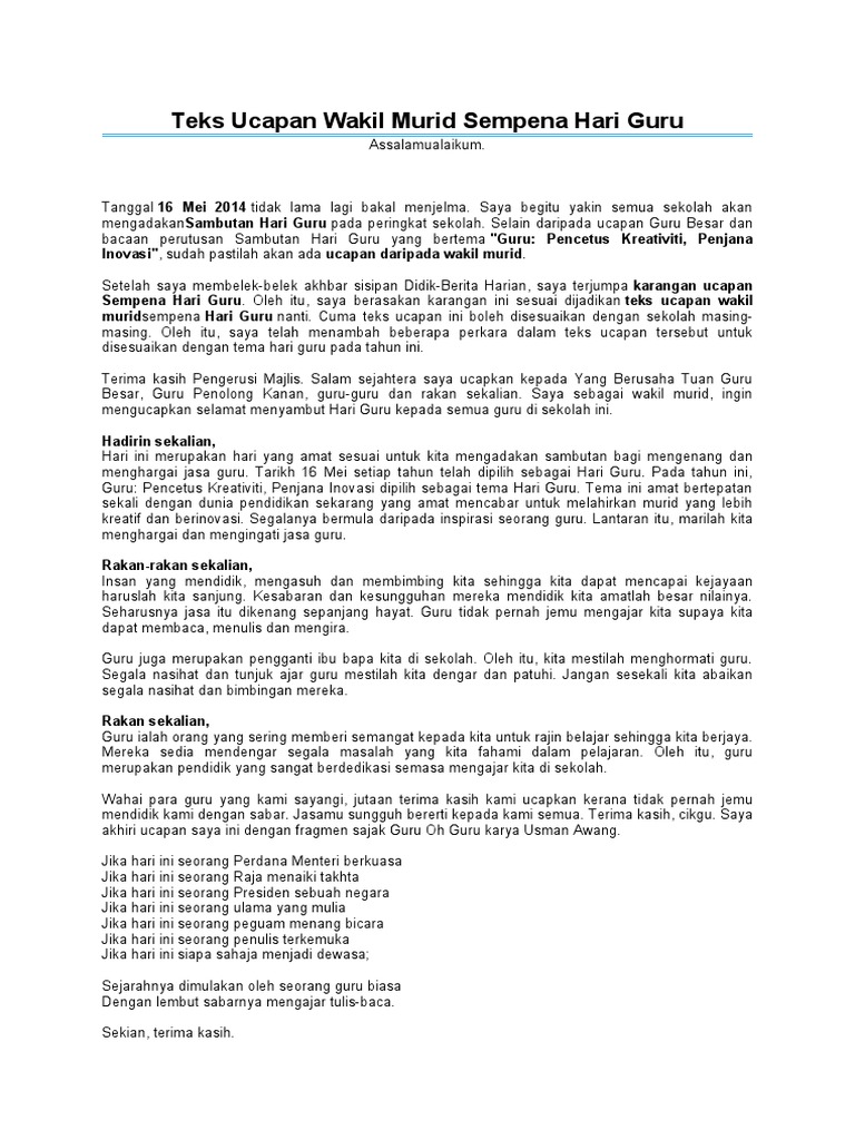Teks Ucapan Hari Guru Oleh Wakil Murid Pdf