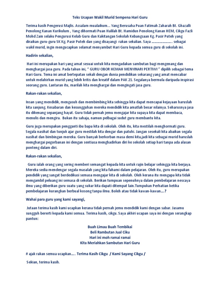 Teks Ucapan Wakil Murid Sempena Hari Guru Pdf